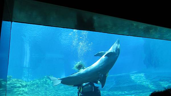 我們還遇到了海豚在水中的表演喔~,雖然隔著玻璃,但指導員跟海豚都很熱情在招呼我們呢!!